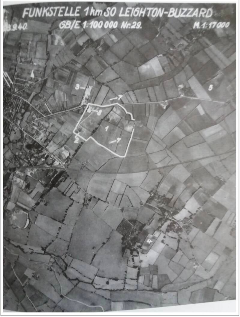 German air reconaissance photo of the Q Central site. Germans intelligence has marked the ‘main building’ (3). This was a decoy. The site was underground and underneath the fields to the east.